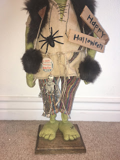 He wears a fur vest with pom tassels. A wood sign that you paint to say what you'd like. Happy Halloween or No trespassing. Hanging from his belt is a skeleton and cute assorted tags and spiders.